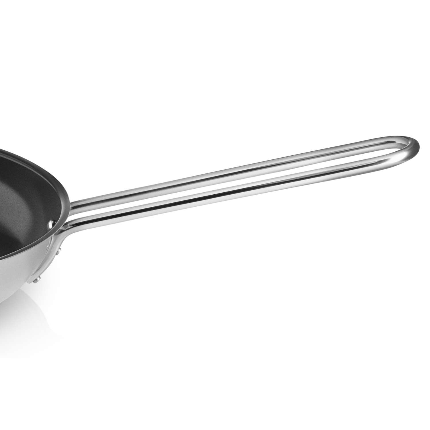 Håndtag i kraftig rustfrit stål. Disse er punktsvejset på og bliver ikke varmere, end du kan holde på dem. Det gælder dog ikke, hvis du bruger panden på gaskomfur eller i ovn.