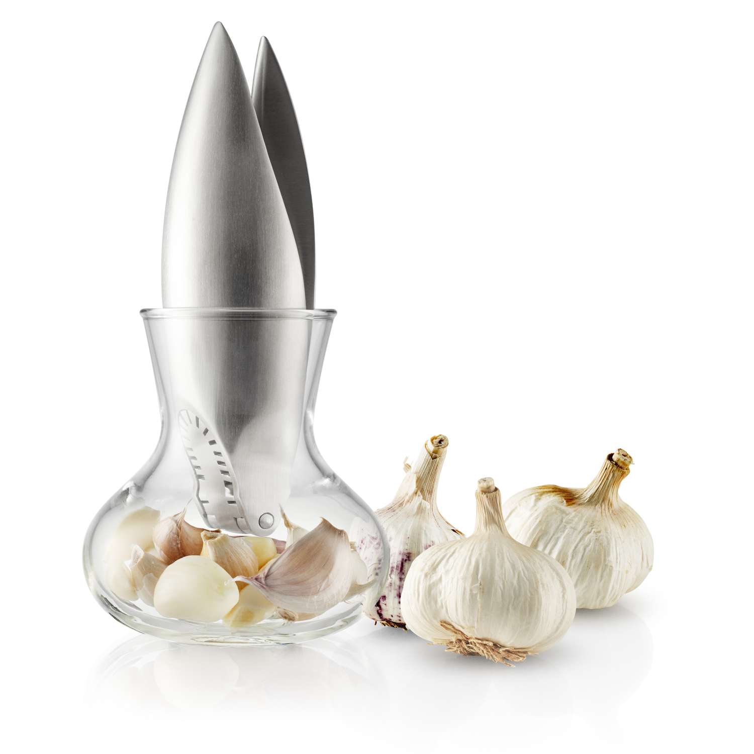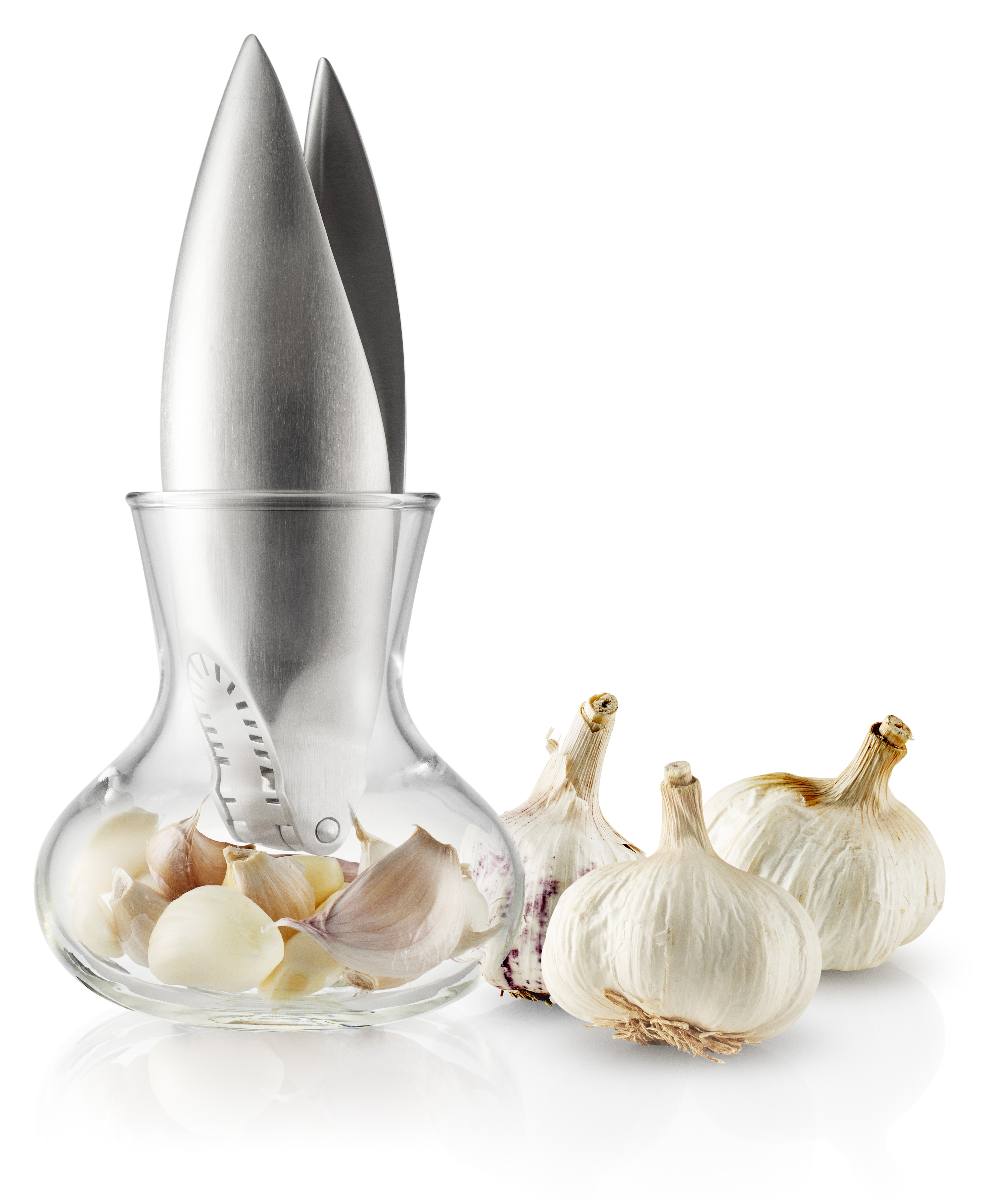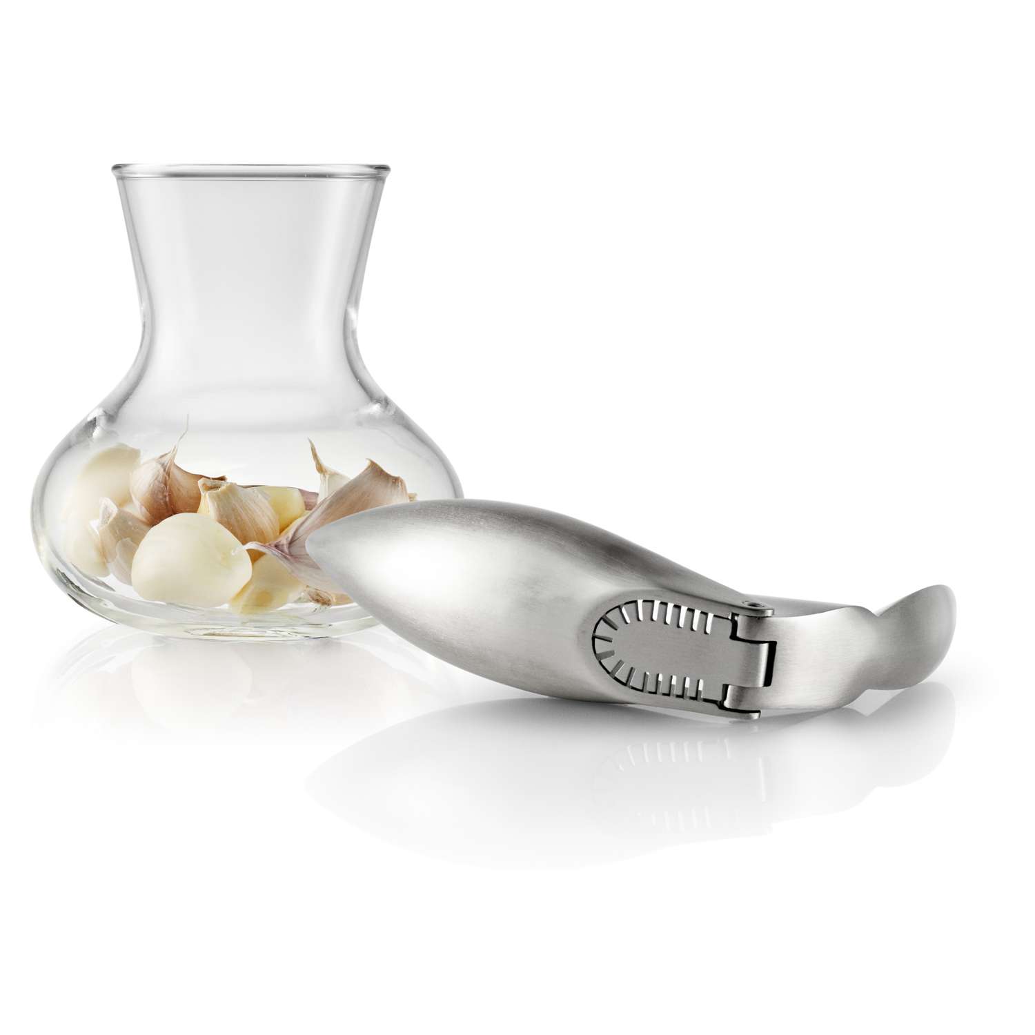 Både hvidløgspresser og glasbeholder tåler maskinopvask.