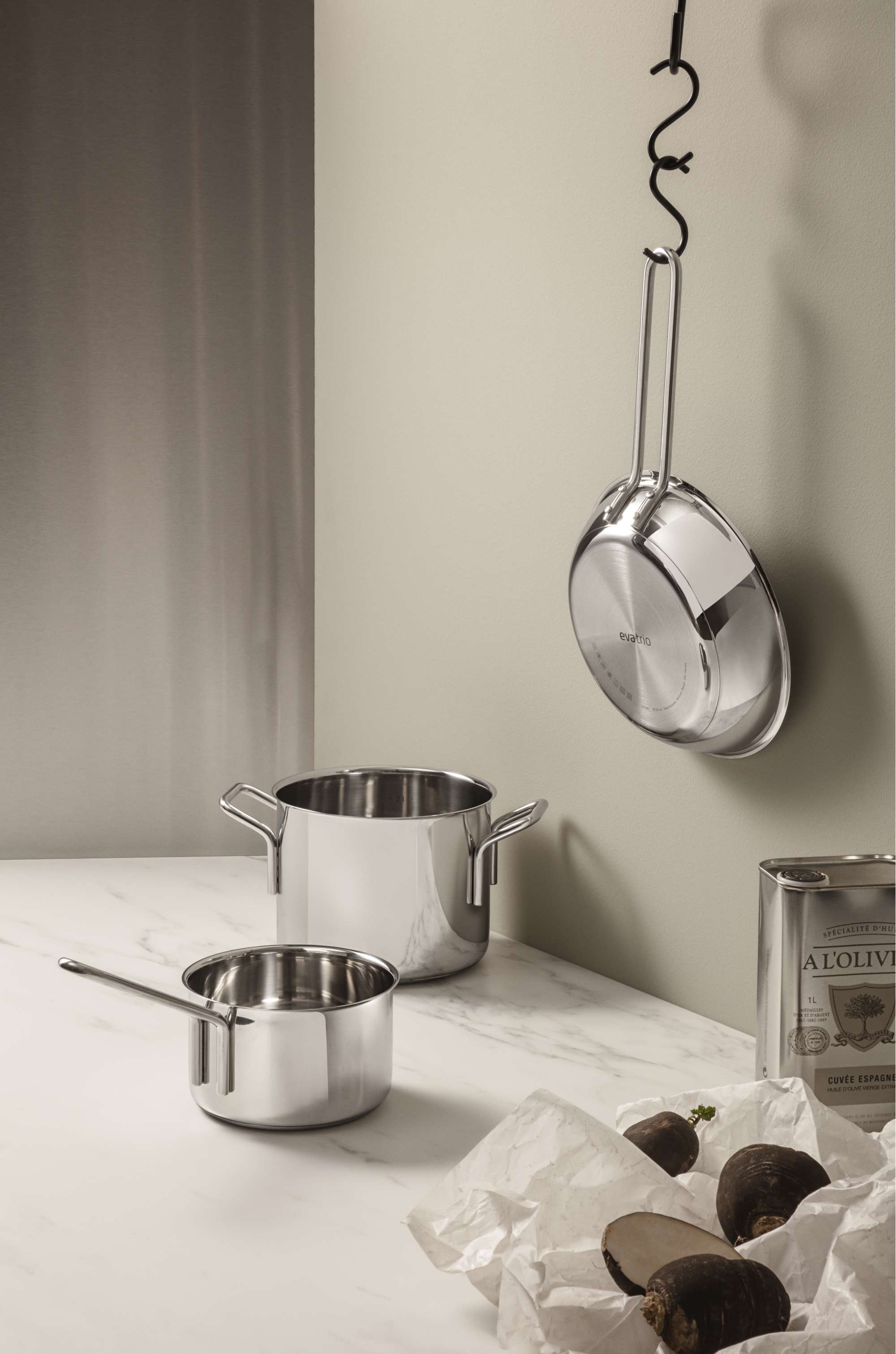 Mit einem kompletten Starterset, bestehend aus drei praktischen Töpfen in verschiedenen Größen und einer Bratpfanne, sind Sie für alle Kochaufgaben bestens gerüstet. Das Set ist ideal für die Zubereitung von Mahlzeiten für eine oder zwei Personen. Der Körper der Töpfe und Pfannen besteht zu 90 Prozent aus recyceltem Post-Consumer-Edelstahl, einem Material, das äußerst langlebig und leicht sauber und ordentlich zu halten ist. Das Design basiert auf dem klassischen Ole Palsby/Eva Trio-Design von 1977 und gewährleistet die Kompatibilität mit vorhandenen Eva Trio-Deckeln. Die Töpfe und Pfannen sind spülmaschinenfest und für alle Herdarten geeignet.
