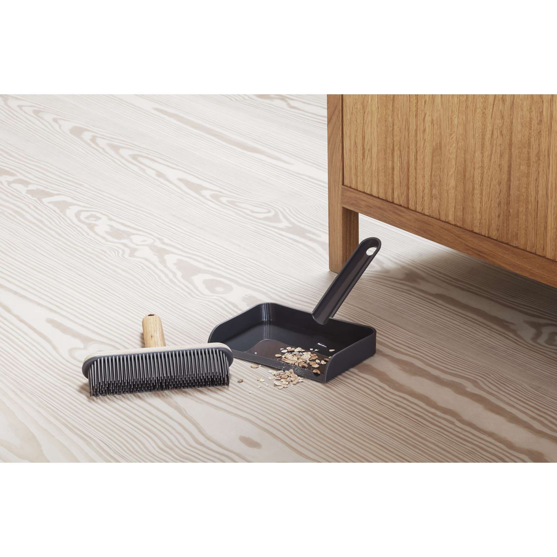 An indispensable duo for light cleaning: minimalist-design broom and dustpan. The broom features silicone bristles for both wet and dry sweepings, and the dustpan is designed with a sharp blade for smooth collection of dust and dirt in the pan. The silicone bristles can be rinsed in hot water to keep the broom clean and hygienic at all times. When not in use, the broom stows in the dustpan, so the set takes up minimal space.