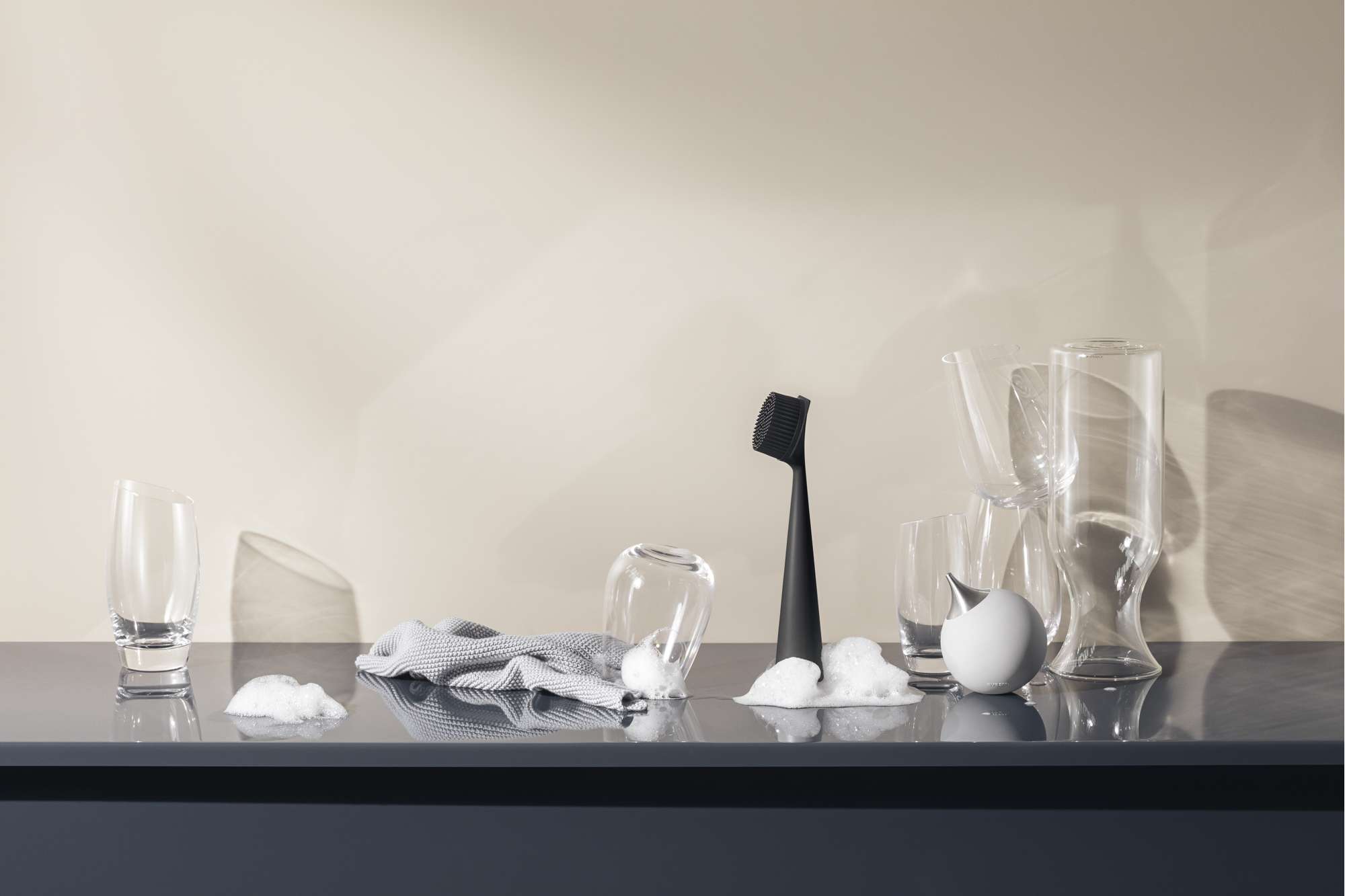 The soft yet durable silicone bristles dry quickly as the brush sits on the kitchen surface. The handle is weighted to prevent it from falling over. The brush is easy to clean and maintain, withstands high temperatures and is dishwasher-safe.
