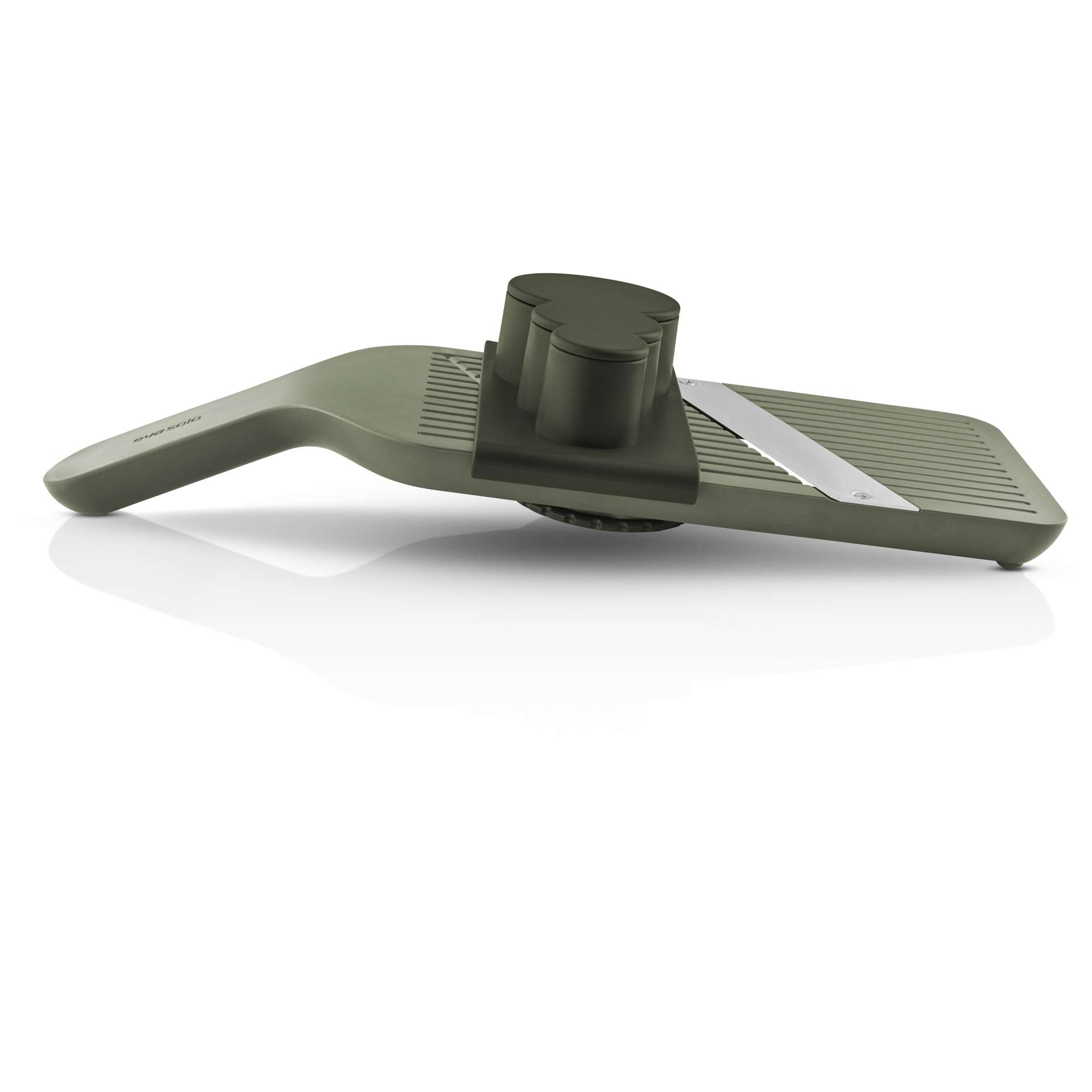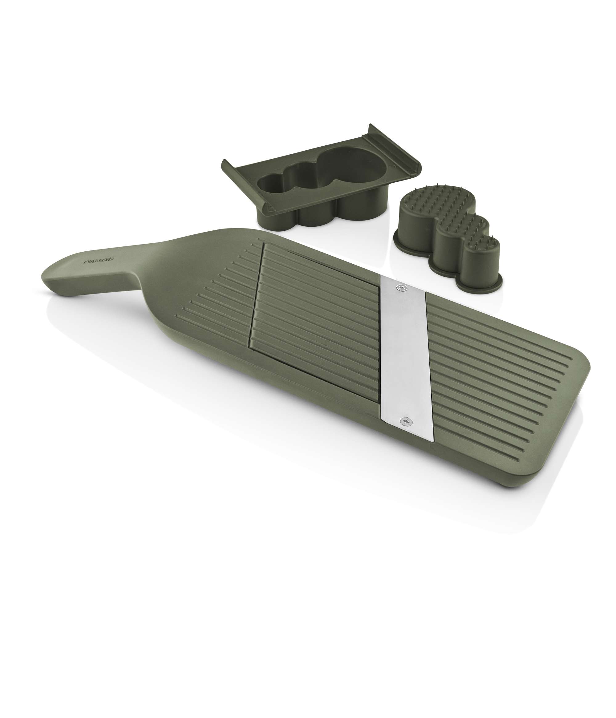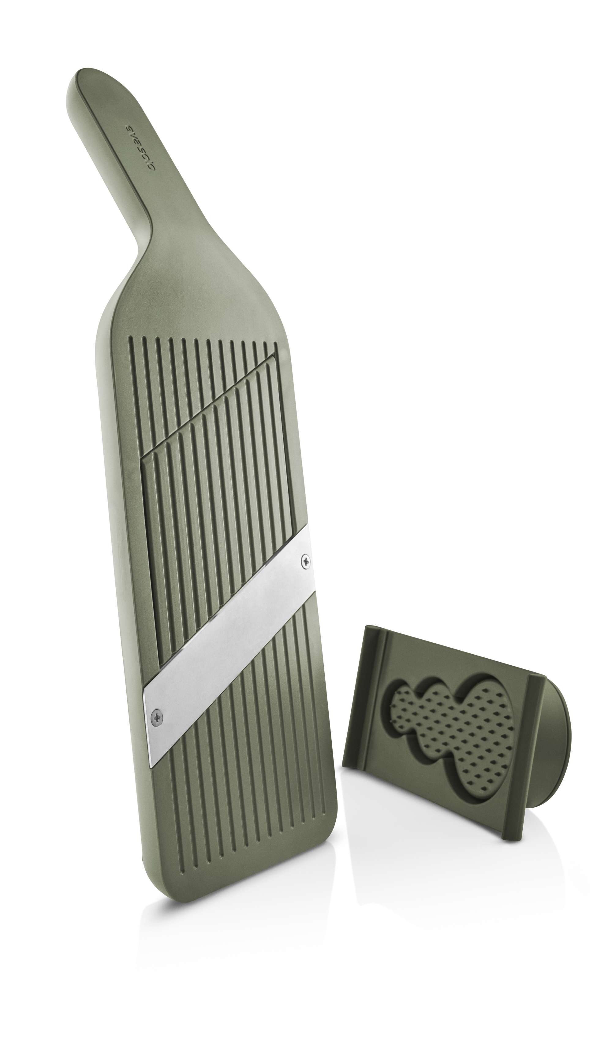 The screw at the back of the mandolin can be adjusted to change the slicing thickness. Simply turn the dial on the underside of the mandolin. The rubber retainers on the base stabilise the mandolin and the robust, ergonomic handle ensures a comfortable, secure grip. The mandolin’s design gives you a perfect, natural working angle for slicing straight into a bowl or on a chopping board. Dishwasher-safe.