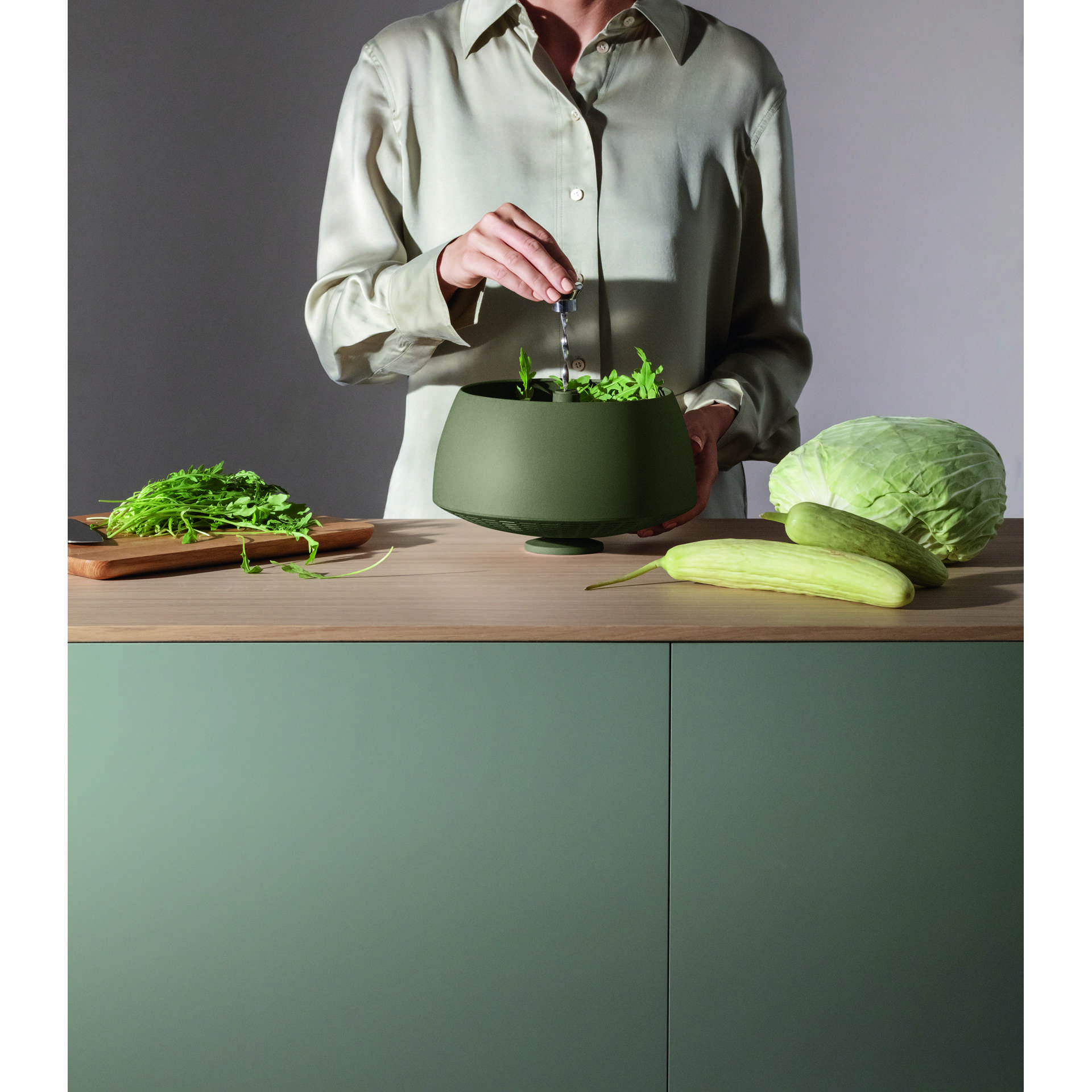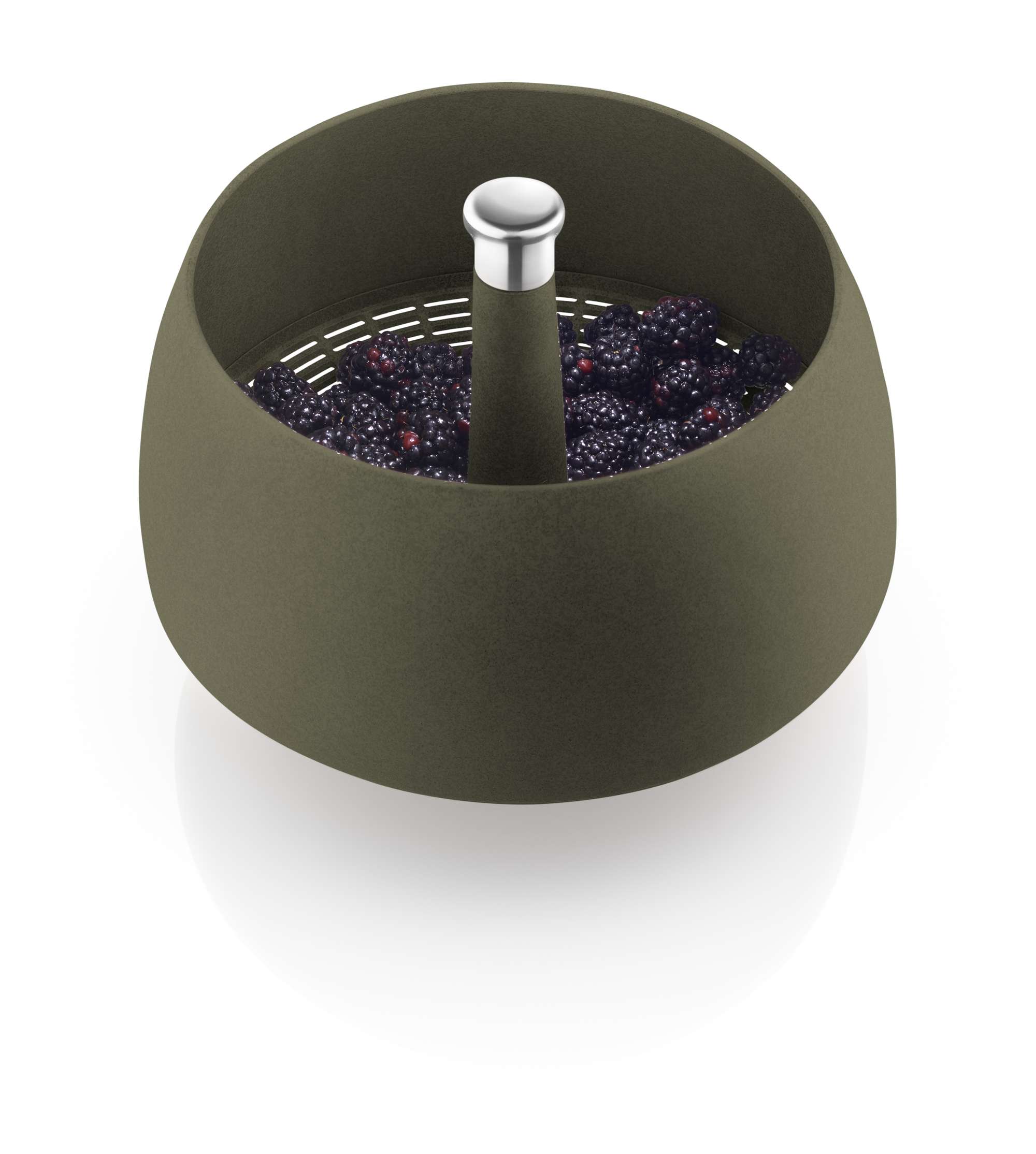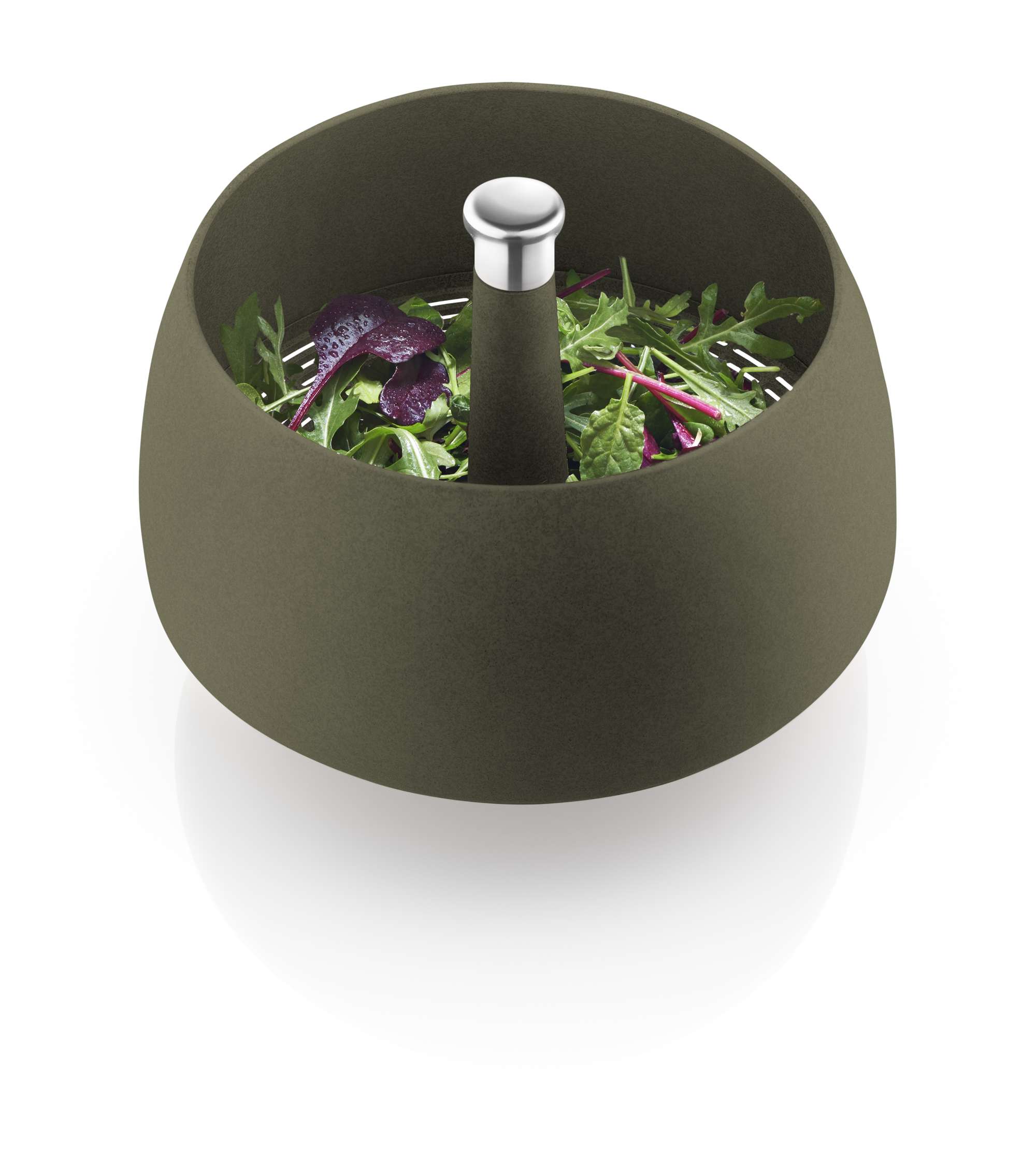 Two-in-one salad spinner and colander – ingeniously simple. Rinse the lettuce in the spinner, push down on the axle in the middle until all the water has been spun out. The water drains out through the holes in the bottom. It is also perfect for rinsing fruit, draining water from pasta etc.