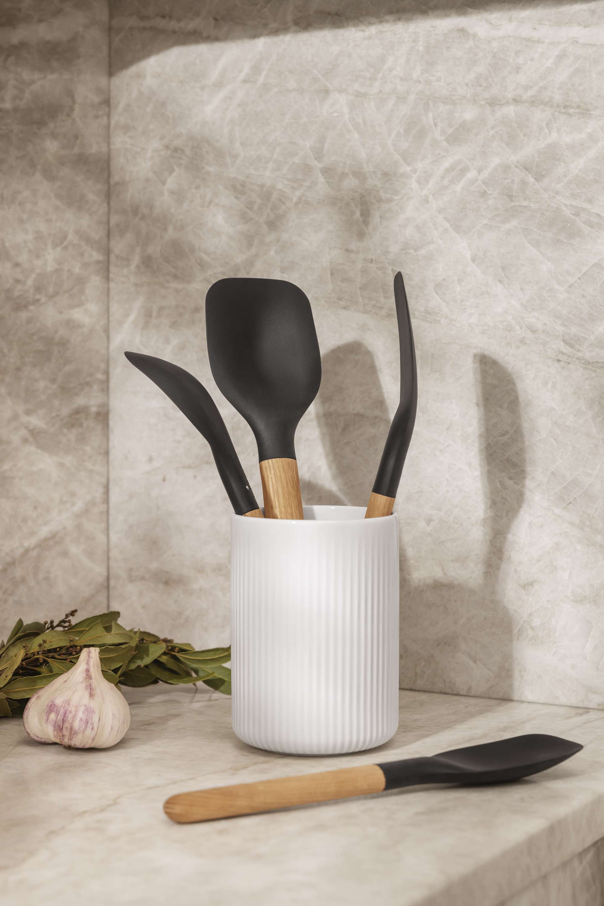 A versatile kitchen utensil that will make cooking easier. In addition, the rustic oak handle and black silicone will add a stylish touch to your kitchen. Just like a sharp chef’s knife, a good serving spoon, stirrer or spatula can make all the difference when pots and pans are simmering on the stove, and you’re busy cooking.