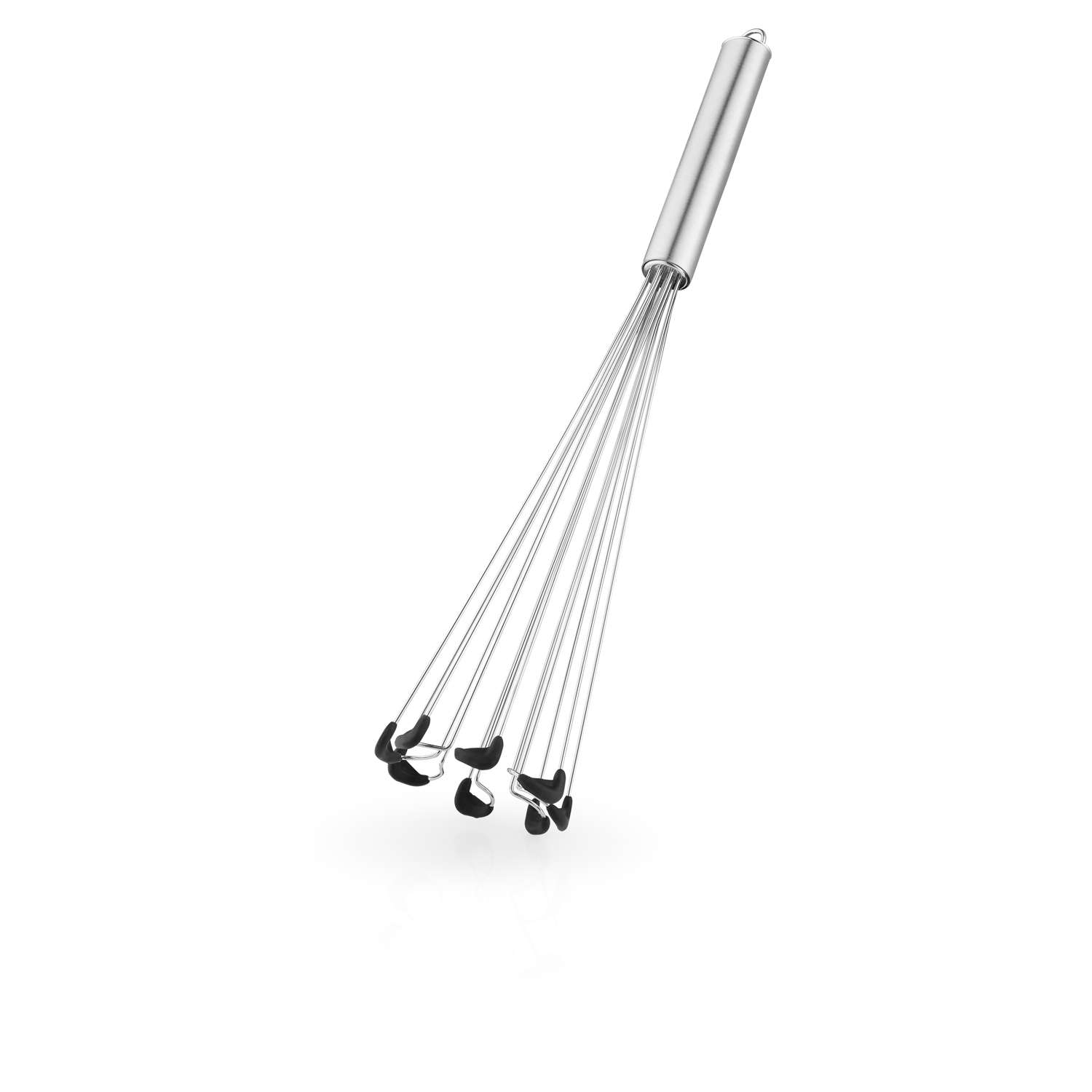 The design of the whisk ensures effective whisking while preventing, for example, herbs from collecting in the middle of the utensil. Thanks to its functional design, the whisk can get right to the edge of the pot. Also, it can be left in the pot when not in use, thereby avoiding sauce dripping on the kitchen surface.