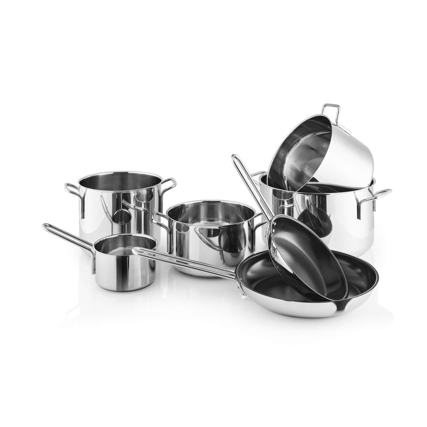 - Includes: Saucepan 1.1 l, Pot 3.6 l, Pot 4.8 l, Pot 6.5 l, Pot 9 l, Frying pan Ø20 cm, Frying pan Ø28 cm