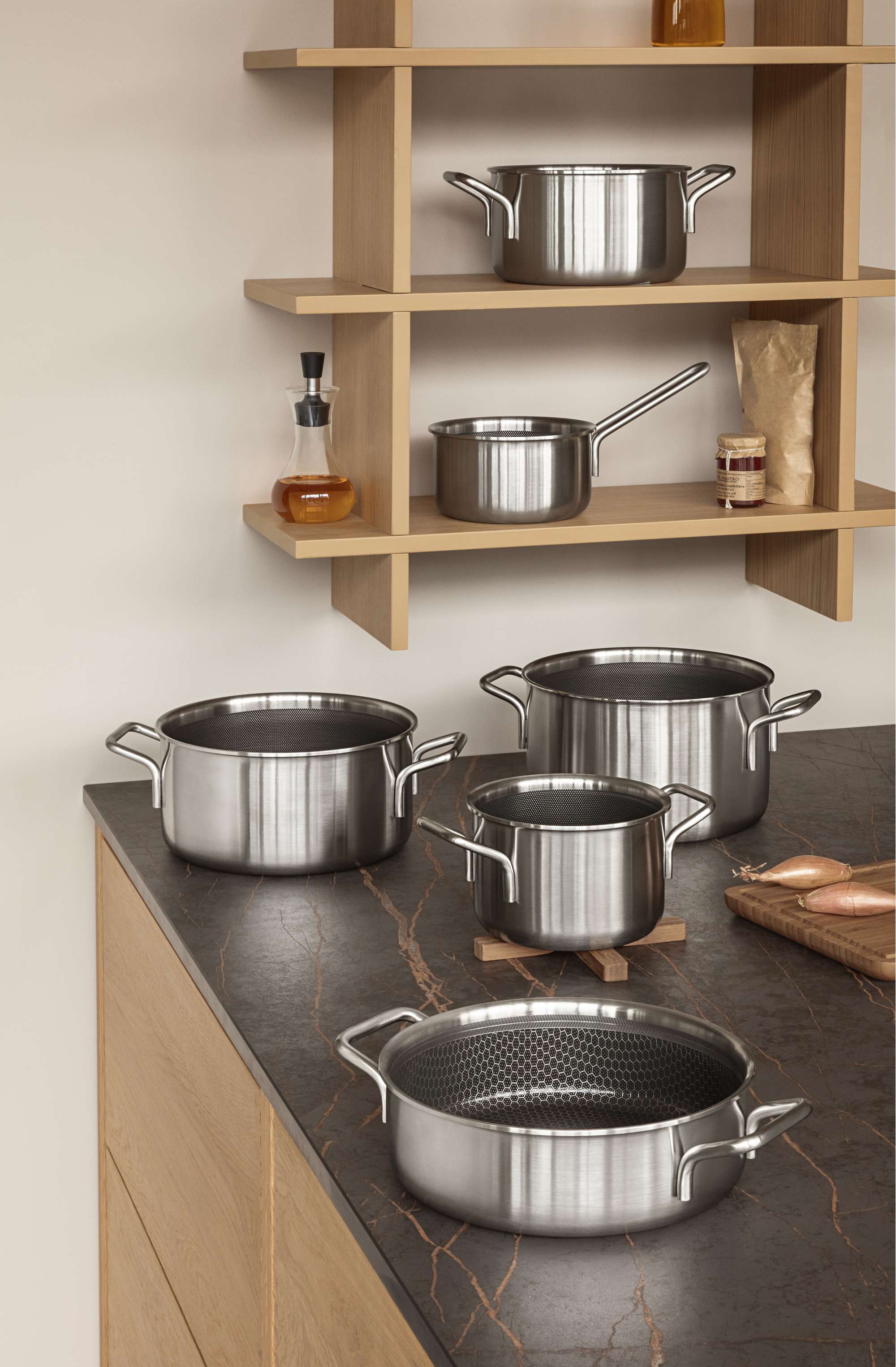 This cooking pot unites Eva Trio’s design features and renowned quality with next-generation enhancements and materials. The interior is coated with a striking pattern consisting of stainless steel at the top and a ceramic Slip-Let® non-stick coating at the bottom. This combination reduces the risk of ingredients sticking or burning on, while the coating is so durable that you can safely use metal utensils without the risk of damaging it. The body of the cooking pot is made of a combination of 90 per cent recycled post-consumer stainless steel and 100 per cent recycled post-consumer aluminium. The unique Multi-layer sandwich design ensures rapid heating, even heat distribution and a tough exterior resistant to wear and tear. The pot is oven-safe up to 400 °C and is compatible with all heat sources, including induction. It is easy to clean in a dishwasher or with a steel scourer. This cookware is based on the classic Ole Palsby/Eva Trio design from 1977, which ensures that it still offers the renowned Eva Trio features such as cold handles, a pouring lip, stackability and compatibility with lids and other items in the Eva Trio range.