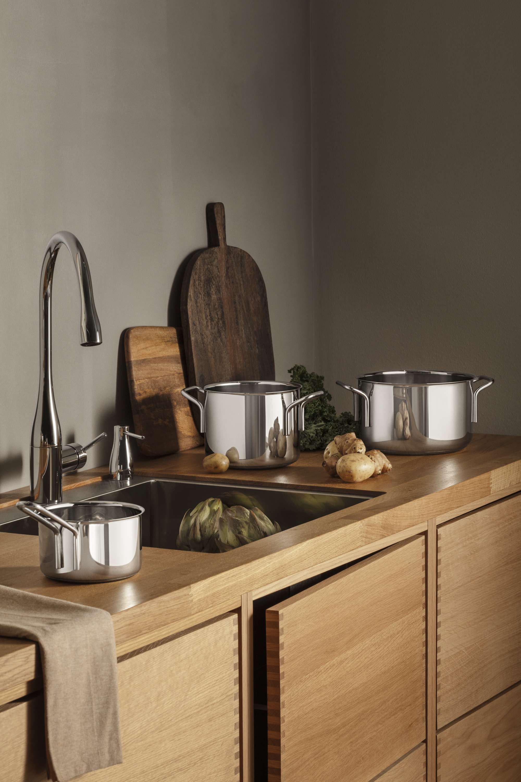 Every kitchen needs a durable stainless steel pot. The robust material withstands daily use, while the sealed-in sandwich base ensures even heat distribution. That's why the pot is the obvious choice when preparing one-pot dishes, cooking pasta or preparing vegetables for family meals. The body of the pot is made from 90% recycled post-consumer stainless steel and the design is based on the classic Ole Palsby/Eva Trio design from 1977, ensuring compatibility with existing Eva Trio lids. The pot is suitable for all types of heat sources and is dishwasher safe.