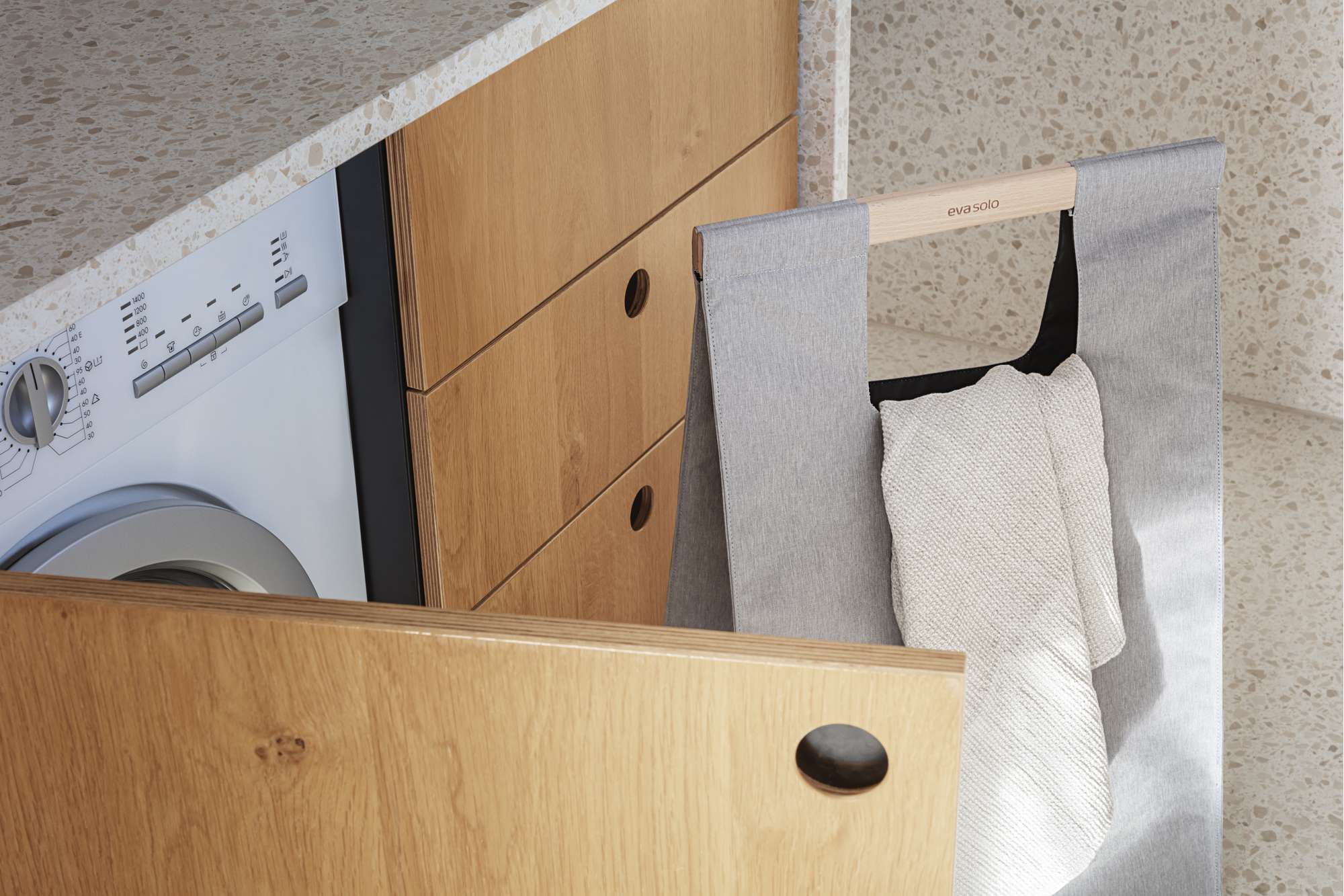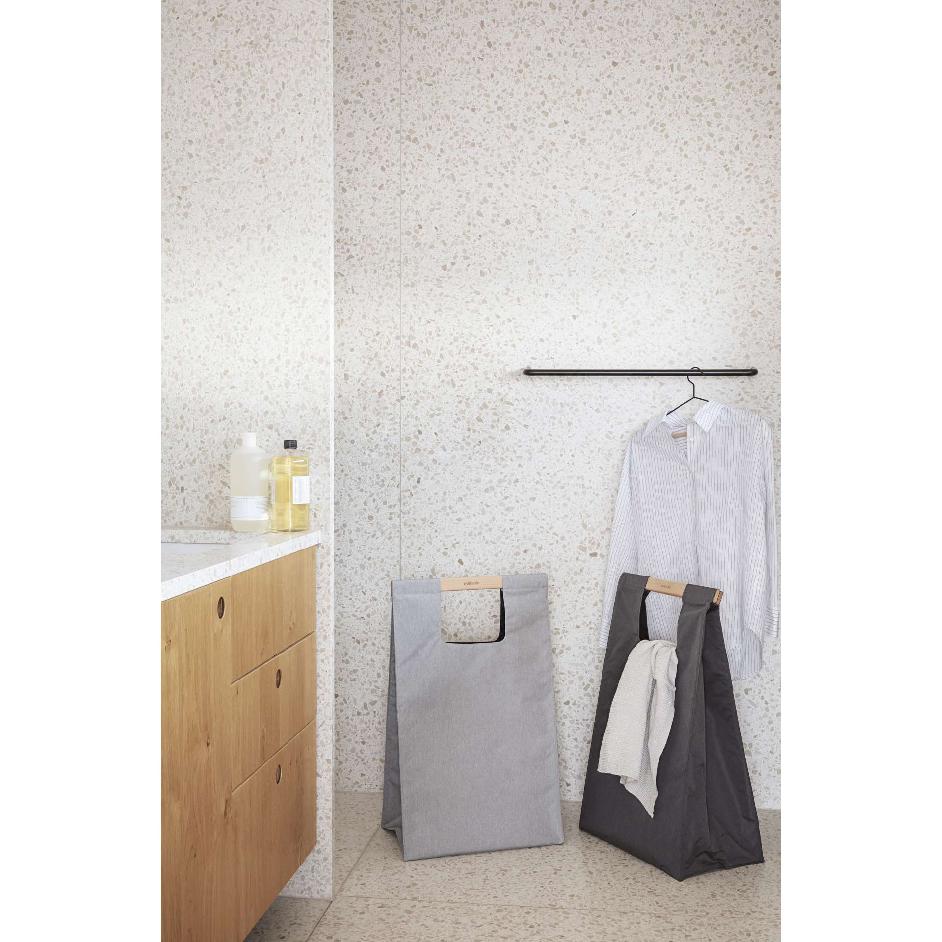 Stow laundry away instantly in a functional all-in-one laundry basket, storage hamper and transport bag. This decorative laundry bag in a refined shade of grey has a practical beechwood carrying handle, allowing the bag to be easily carried into a basement laundry room, for example. Snaps shut easily thanks to the magnetic closure and stands upright without collapsing.
