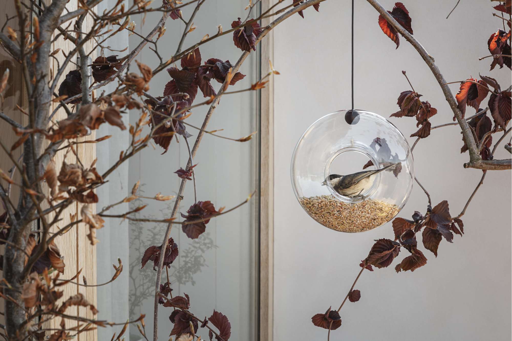 Mounth-blown glass bird feeder with fixture that can be attached to a branch or under an overhang.