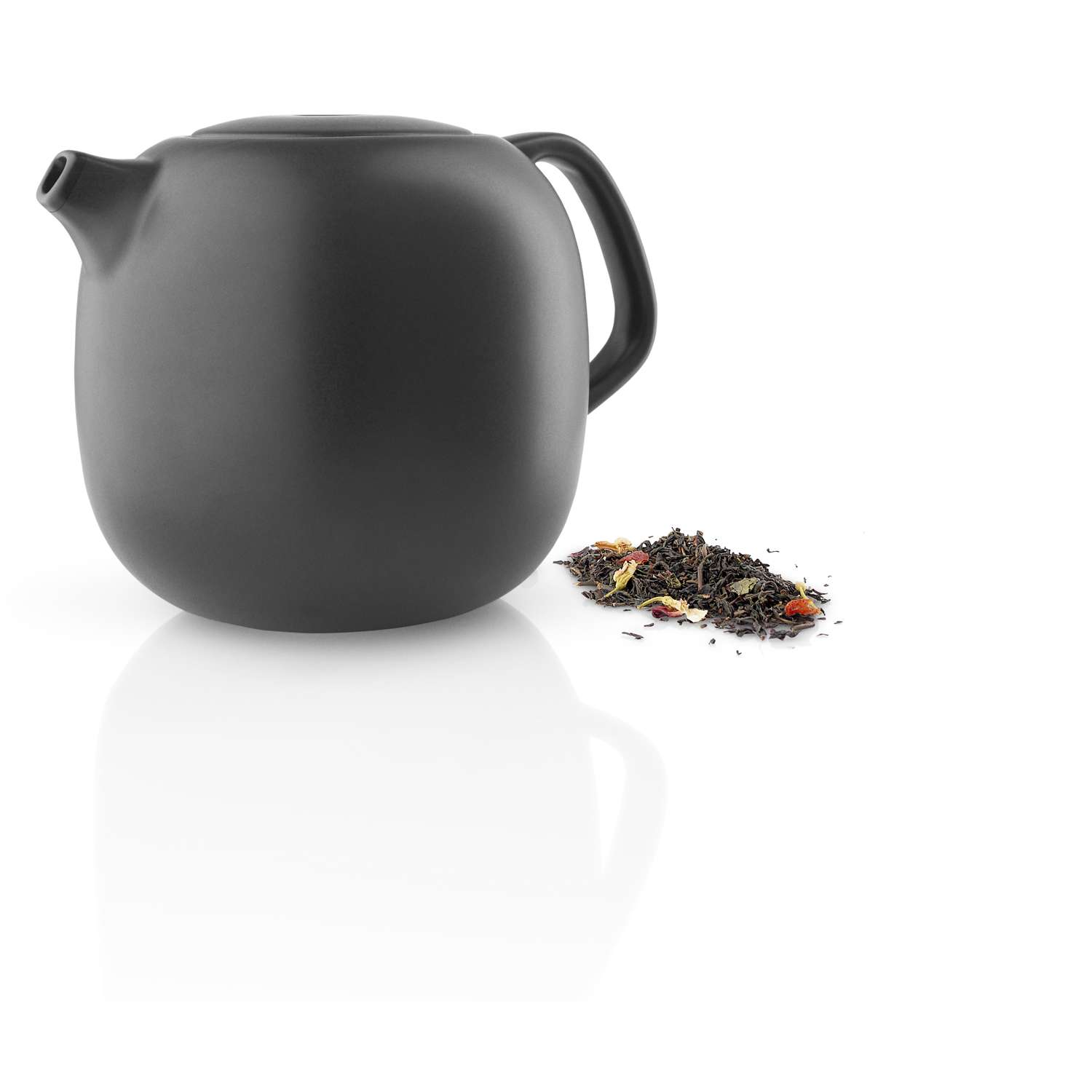 Tekanne i steintøy er med sin enkle form og varme svartnyanse en stilfull måte å servere og nyte dampende varm te på. Passer sammen med steintøyserviset i samme serie i både uttrykk og form. Den svarte silikontuten gjør tekannen 100 % dryppfri. En liten fordypning i lokket gjør at det kan tas av og på med bare én finger.