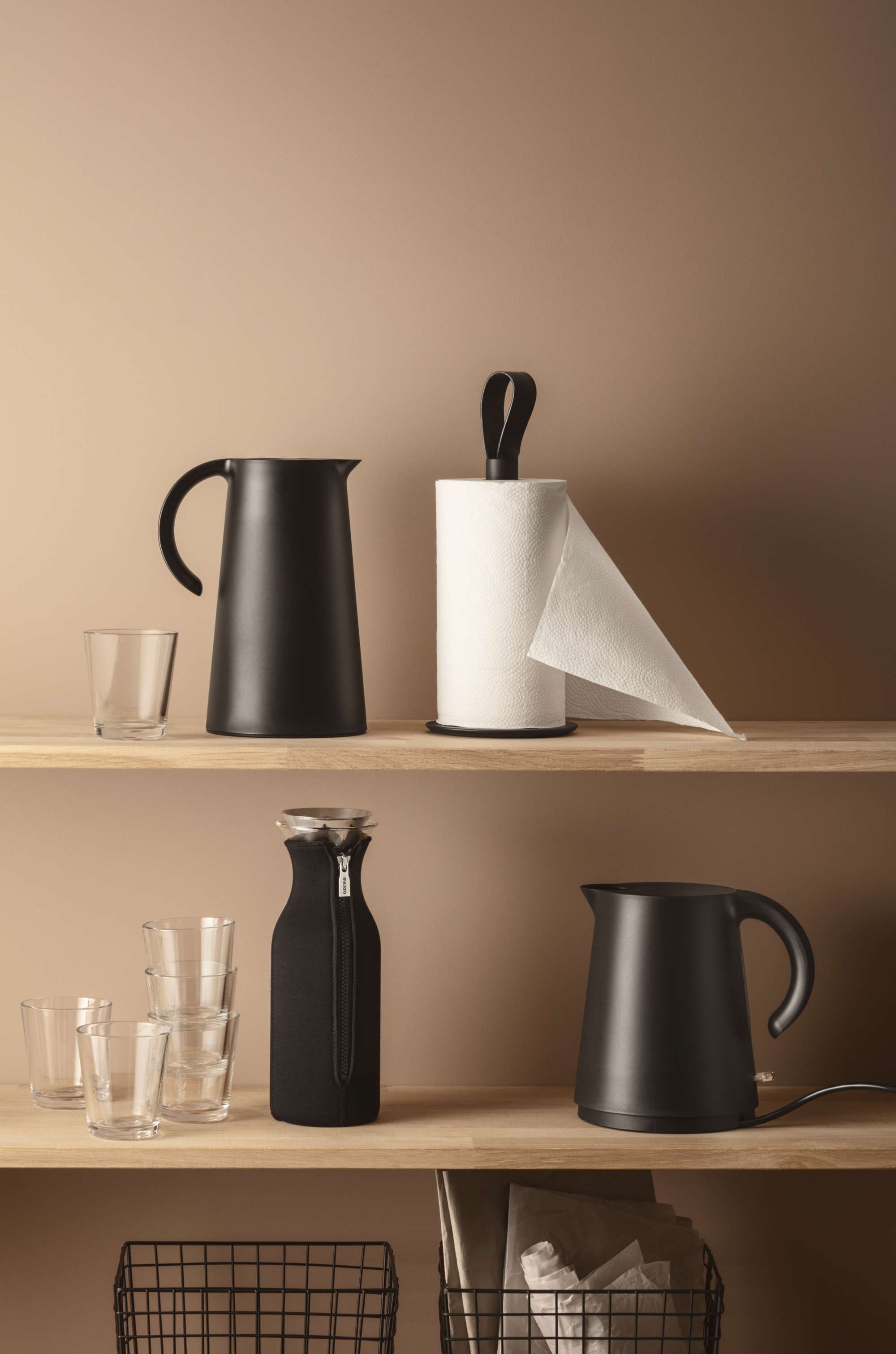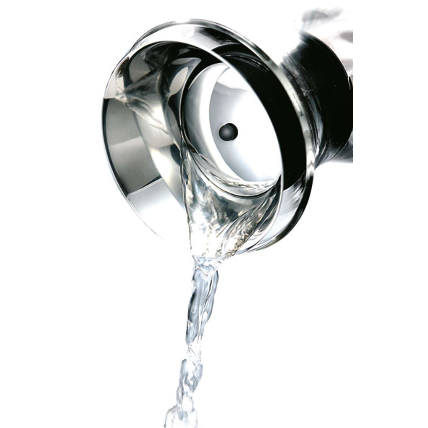 Karaffelen passer i døren på de fleste kjøleskap. Den egner seg godt til både kald og varm drikke. Den patenterte hellekanten i rustfritt stål og silikon sørger for at karaffelen er 100 % dryppfri – innholdet havner i glasset og ikke på duken. Vippelokket som følger med, åpner seg automatisk.